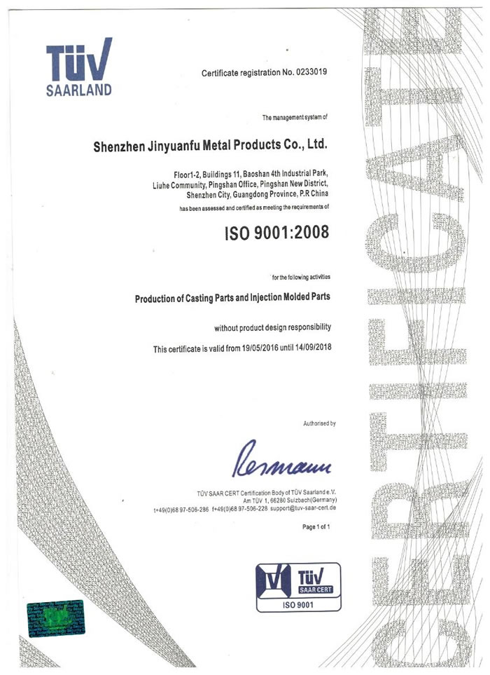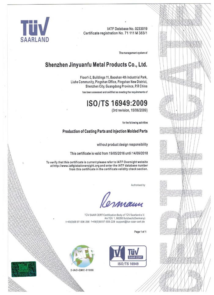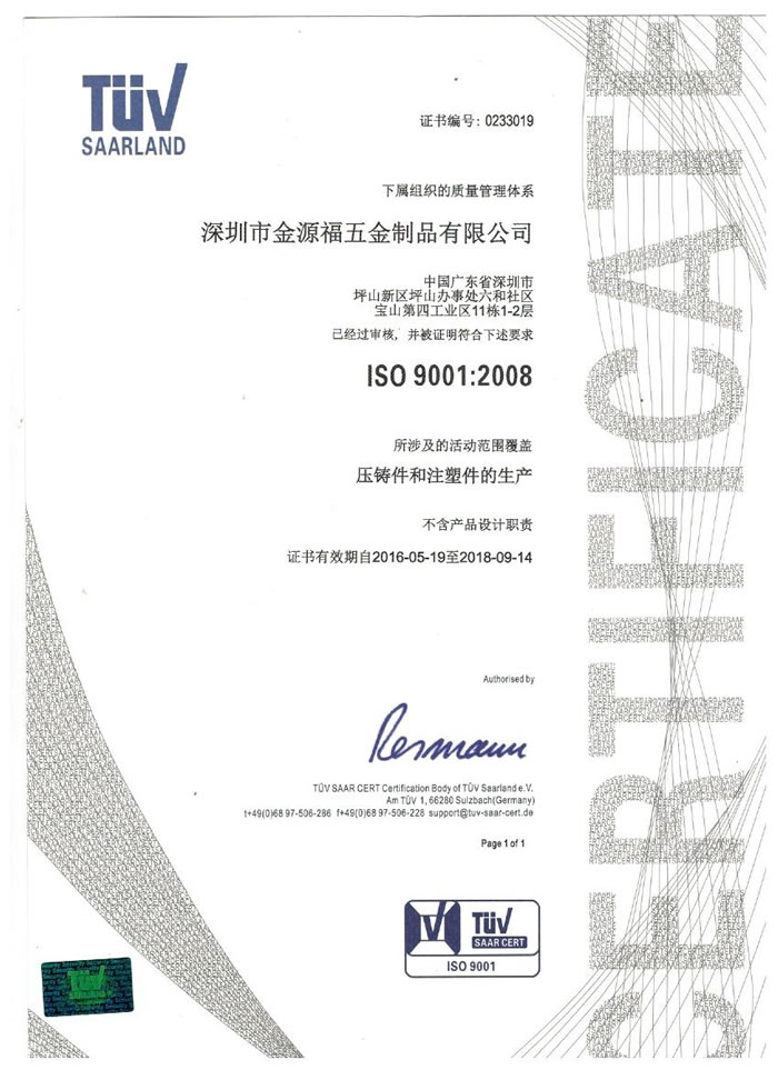 深圳市金源福五金制品有限公司成立于2003年。公司擁有8000多平方米生產廠地、開發與管理精英人才、技術專業、設備精良、交通便利、服務周全、具體設計、開發、制模、出樣、生產到成品出貨一體化模式生產廠家。已通過ISO9001:2008ISO1440/TS16949:2009國際質量體系認證。專業生產鋅合金壓鑄、鋁合金壓鑄產品、汽車配件、汽車后視鏡支架、車載導航散熱器、LED散熱器、LED燈罩、數碼電子五金結構件、家具五金裝飾件、標牌(LOGO)等五金壓鑄產品。